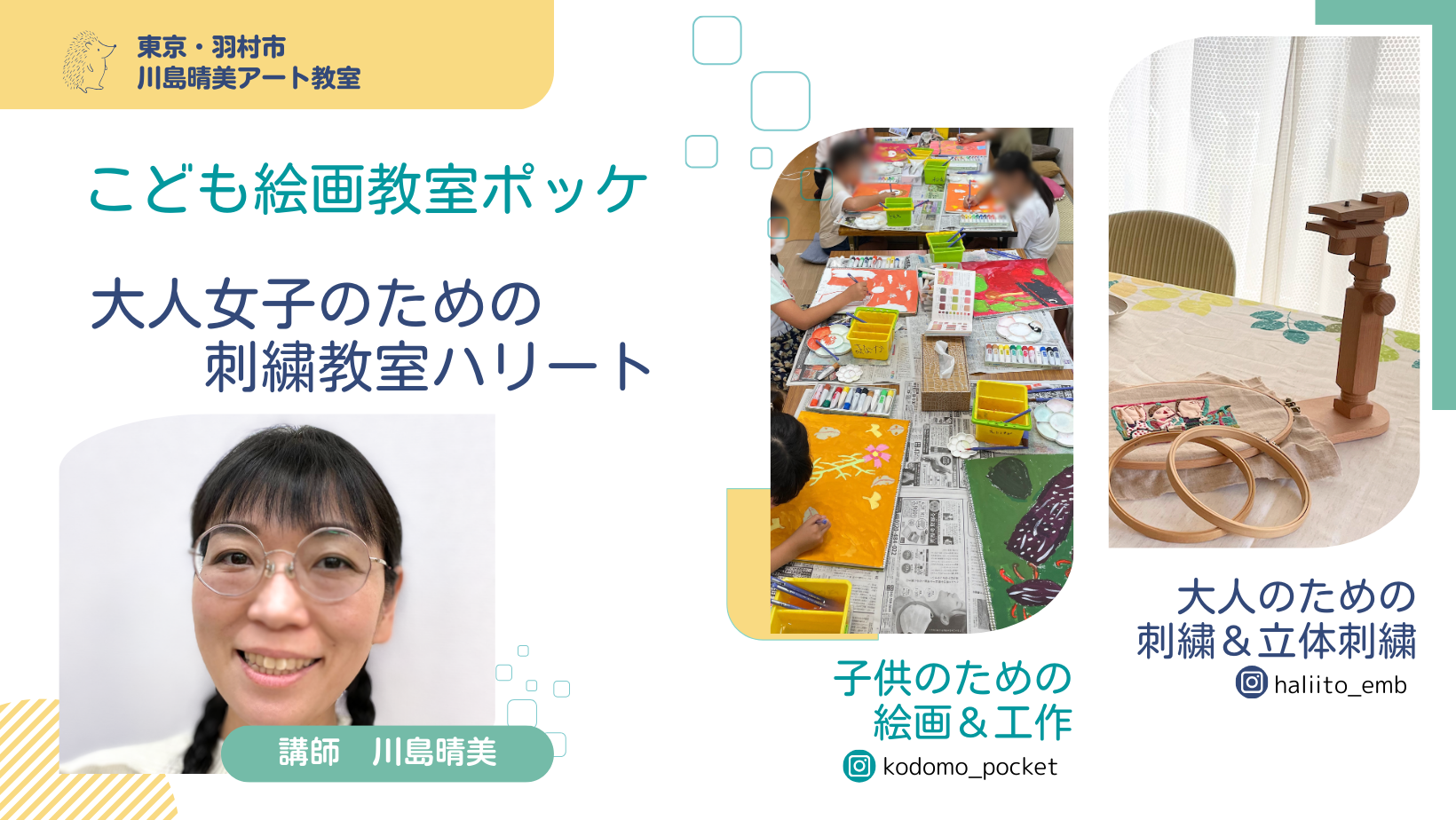 ハリート刺繍教室と、こども絵画教室ポッケを主宰している