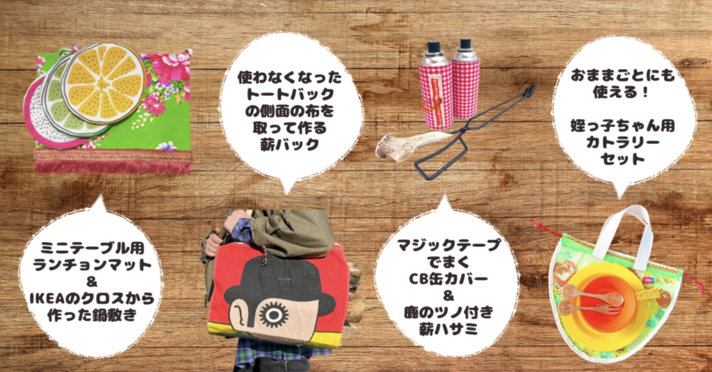 また、ハンメイドのキャンプ用品をママが手作りしていると、
