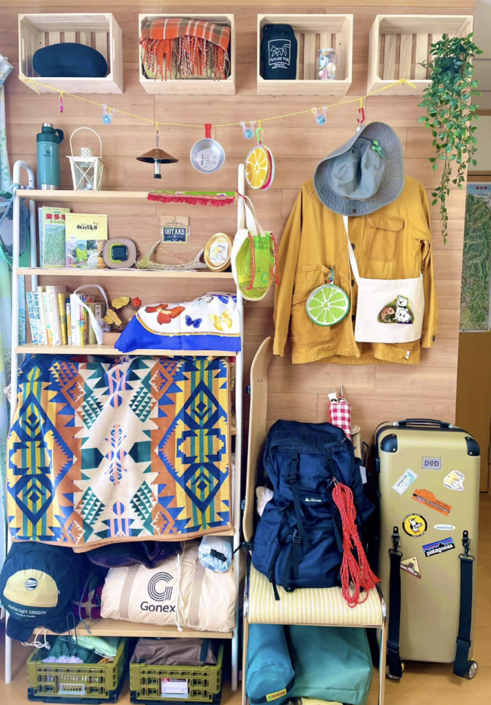 自然モチーフのインテリア雑貨と共に、キャンプ用品を見せる収納にするのが